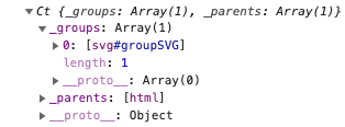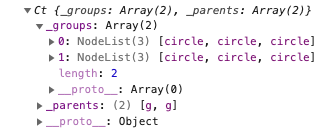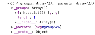 In our example, selection a has one parent (the document’s html element), thus it also has only one NodeList in _groups and that NodeList contains the SVG element that was selected.